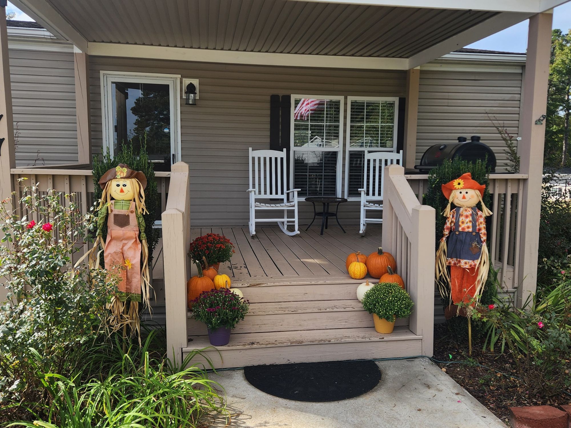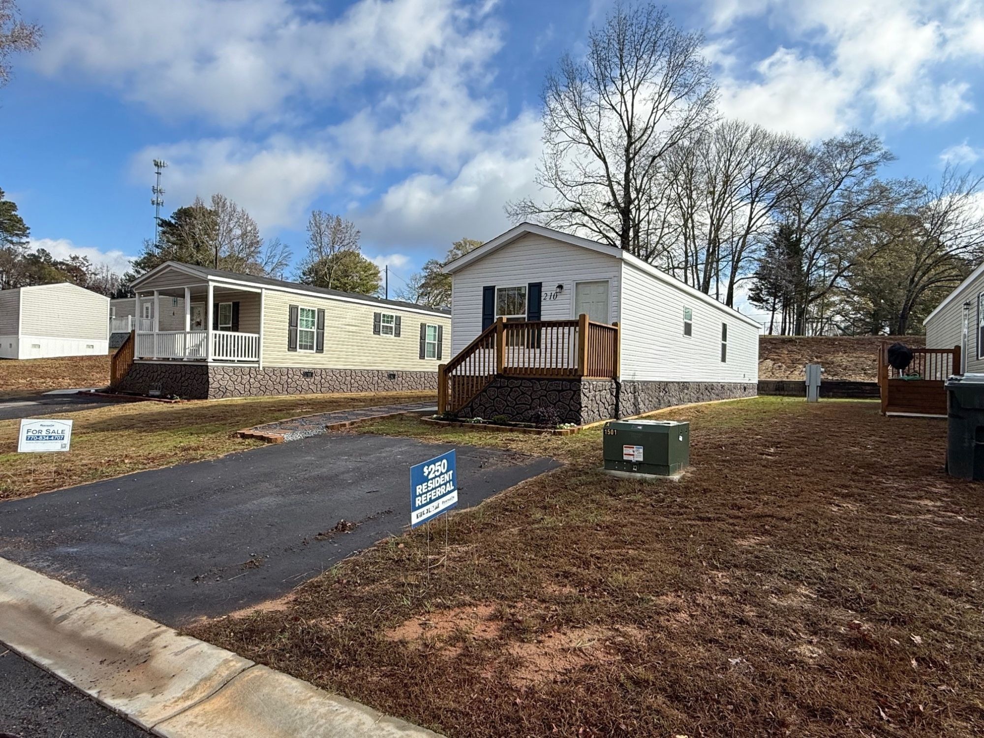 - Fresh landscaping and faux stone skirting