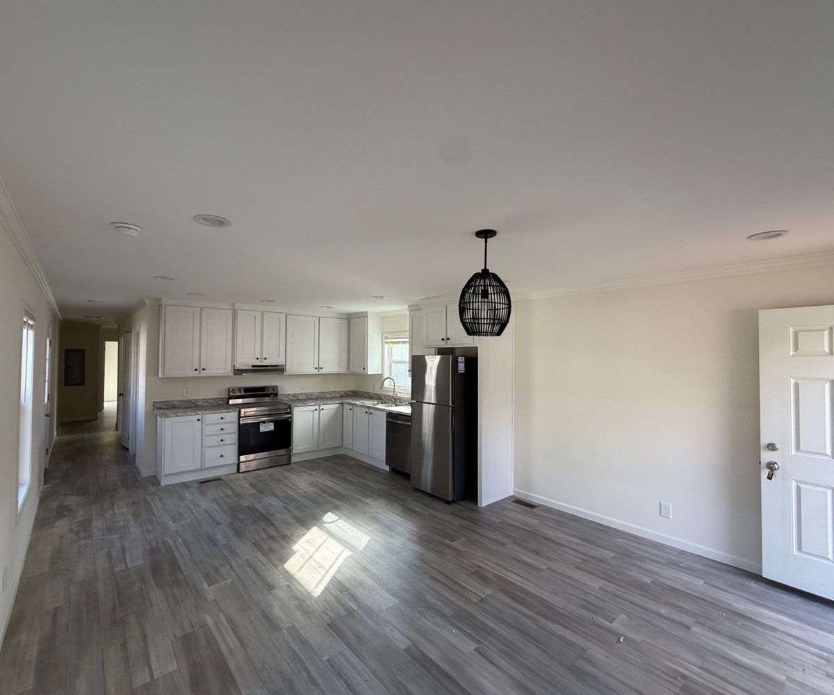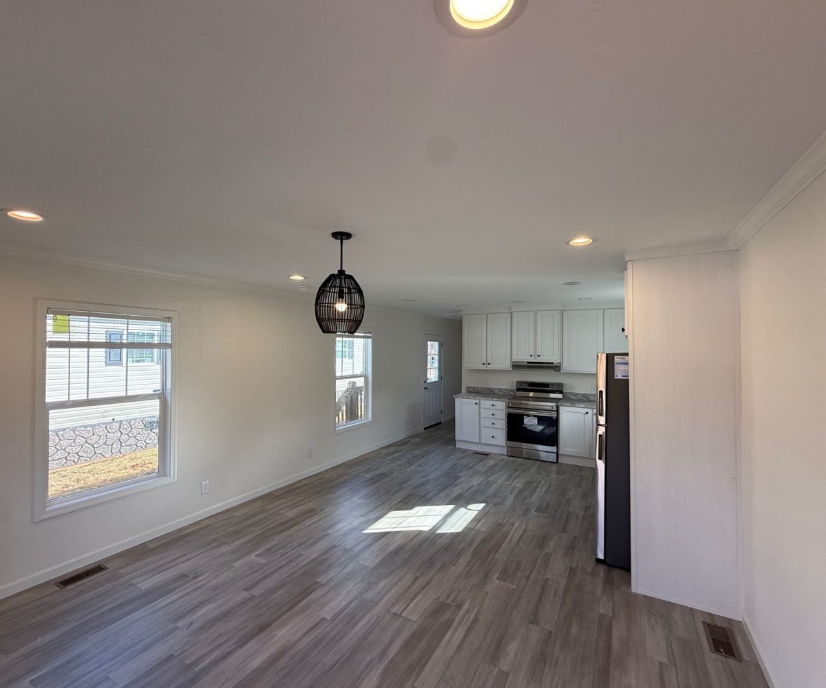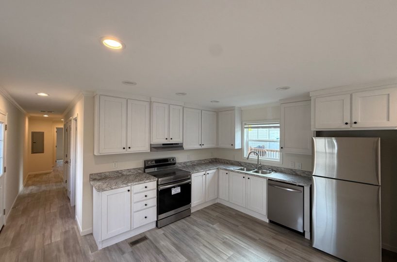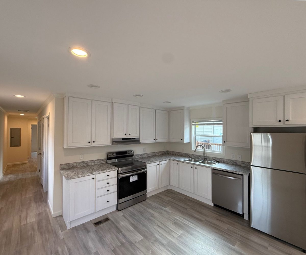Inside, you’ll find durable vinyl flooring throughout and a bright, functional living space that flows easily into the kitchen. The home features brand-new kitchen appliances, stainless steel finishes, and a smart thermostat for added efficiency. In the primary bathroom, a double vanity and extra storage provide everyday convenience.