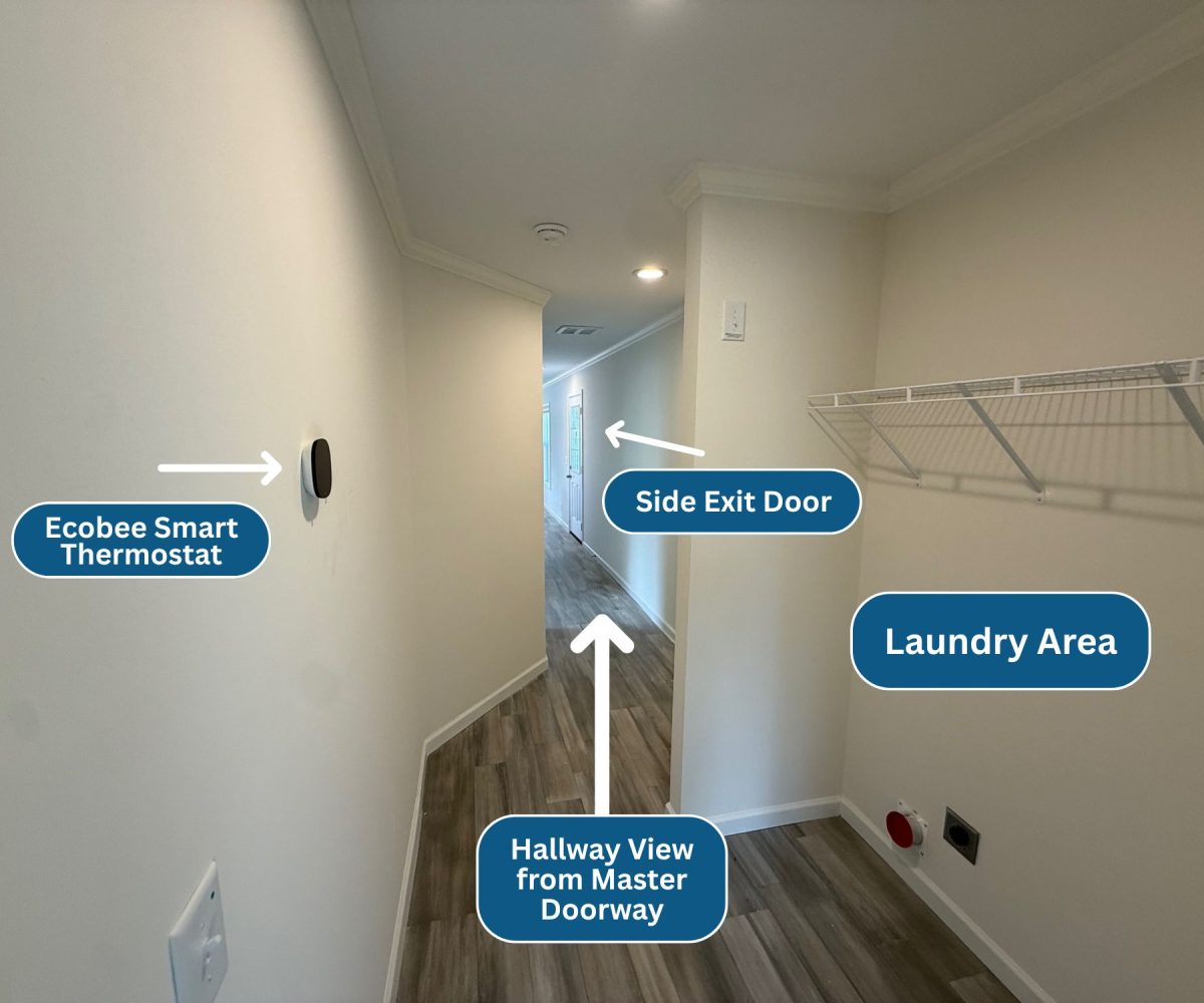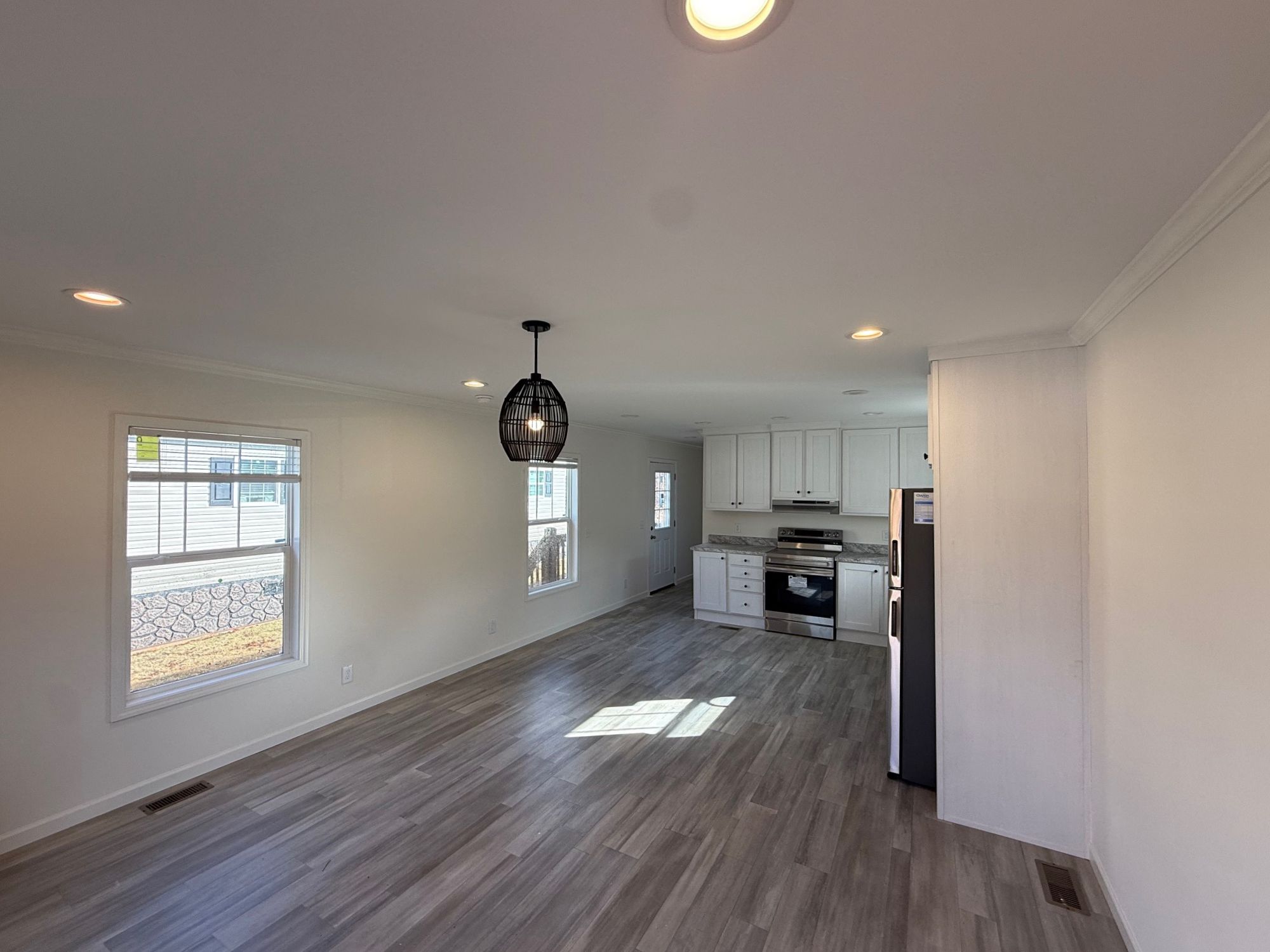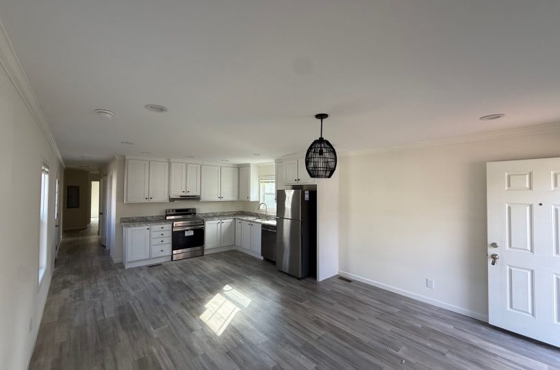 Inside, you’ll find durable vinyl flooring throughout and a bright, functional living space that flows easily into the kitchen. The home features brand-new kitchen appliances, stainless steel finishes, and a smart thermostat for added efficiency. In the primary bathroom, a double vanity and extra storage provide everyday convenience.